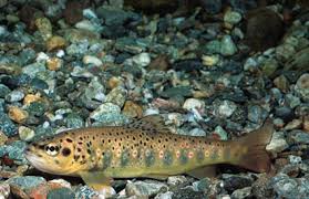 Am Grund des Baches ziehen Forellen dahin Sand schwebt nach oben |